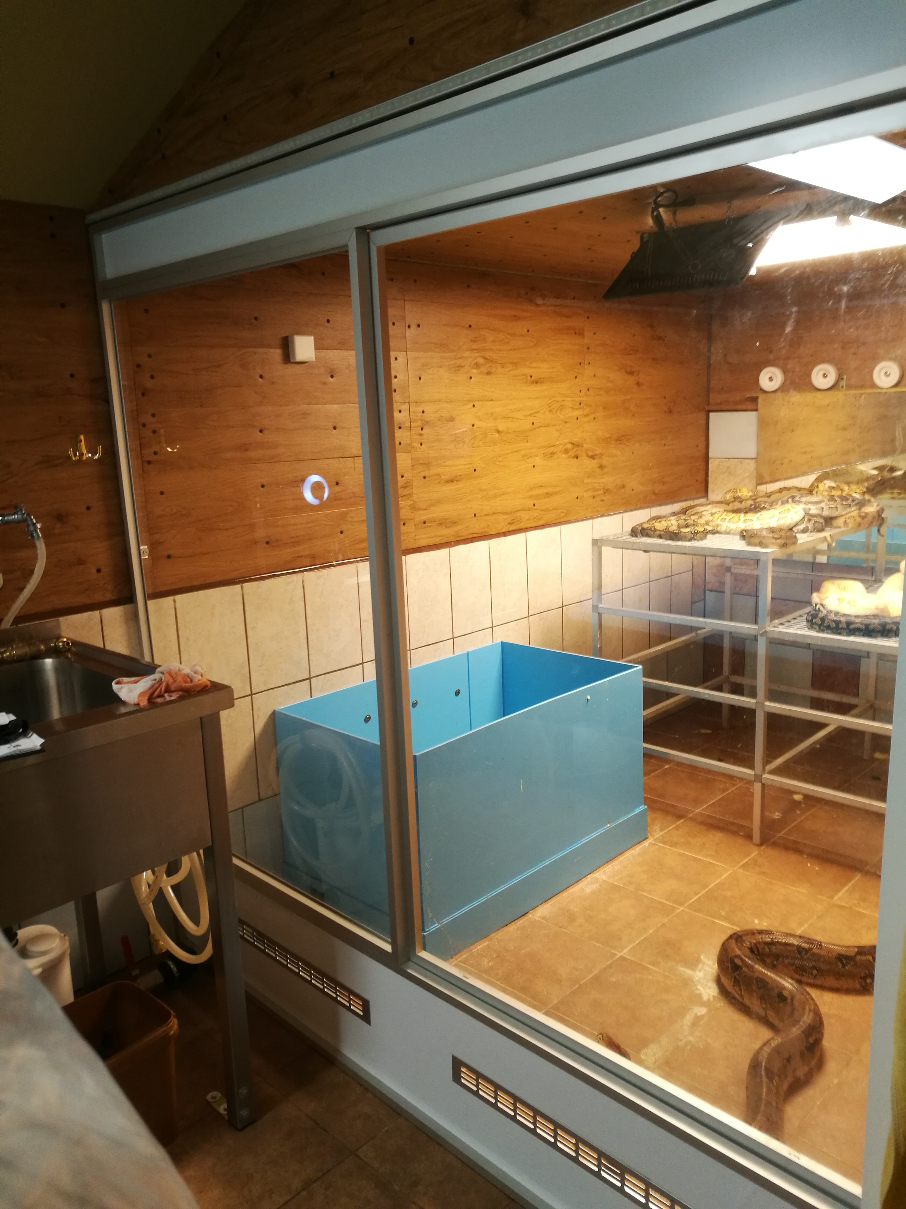 Terárium môže mať rôzne rozmery. Všetko záleží na fantázii chovateľa. Toto terárium tvorí celá malá miestnosť. Len predelenie miestnosti si chovateľ vymyslel z profilov Aluhobby. Spodný sokel tvorí takzvaný hliníkový sendvič založený do profilu s označením HJ20V do týchto výplní sú vyrezané otvory pre umiestnenie odvetrania. Rovnakým spôsobom je postavený aj horný golier steny. Dvere sú z jednej polovice posuvné, výplň – sklo o sile 4mm. Posuvy sú ako v hornej, tak v dolnej lište. Každý posuv má 4 ložiská. Mali sme obavy, či hliníkové profily 20x20 od Aluhobby udržia celú váhu skla. Dnes je to už rok, čo stena bez problémov funguje. Zákazník si objednal ďalšie. Naše obavy boli teda zbytočné.