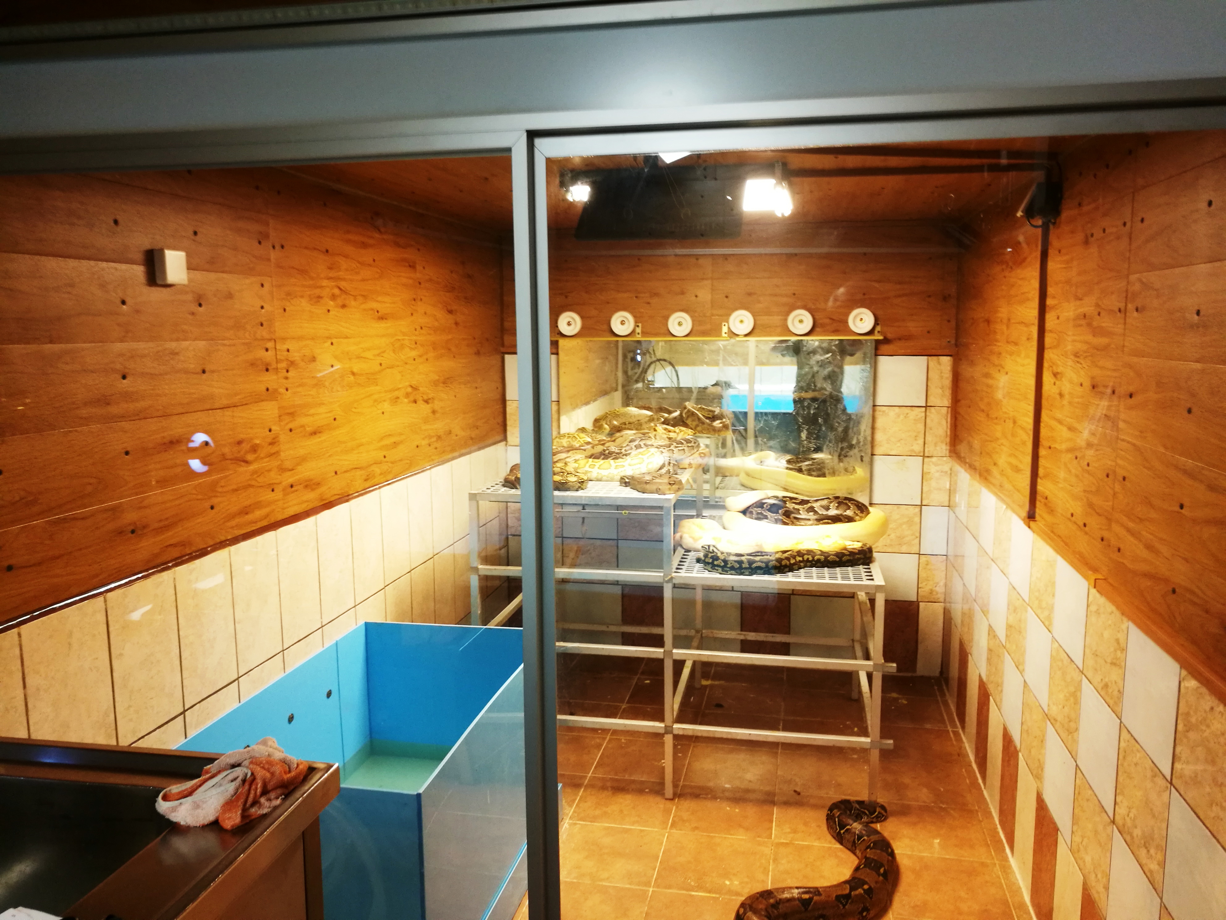 Terárium môže mať rôzne rozmery. Všetko záleží na fantázii chovateľa. Toto terárium tvorí celá malá miestnosť. Len predelenie miestnosti si chovateľ vymyslel z profilov Aluhobby. Spodný sokel tvorí takzvaný hliníkový sendvič založený do profilu s označením HJ20V do týchto výplní sú vyrezané otvory pre umiestnenie odvetrania. Rovnakým spôsobom je postavený aj horný golier steny. Dvere sú z jednej polovice posuvné, výplň – sklo o sile 4mm. Posuvy sú ako v hornej, tak v dolnej lište. Každý posuv má 4 ložiská. Mali sme obavy, či hliníkové profily 20x20 od Aluhobby udržia celú váhu skla. Dnes je to už rok, čo stena bez problémov funguje. Zákazník si objednal ďalšie. Naše obavy boli teda zbytočné.