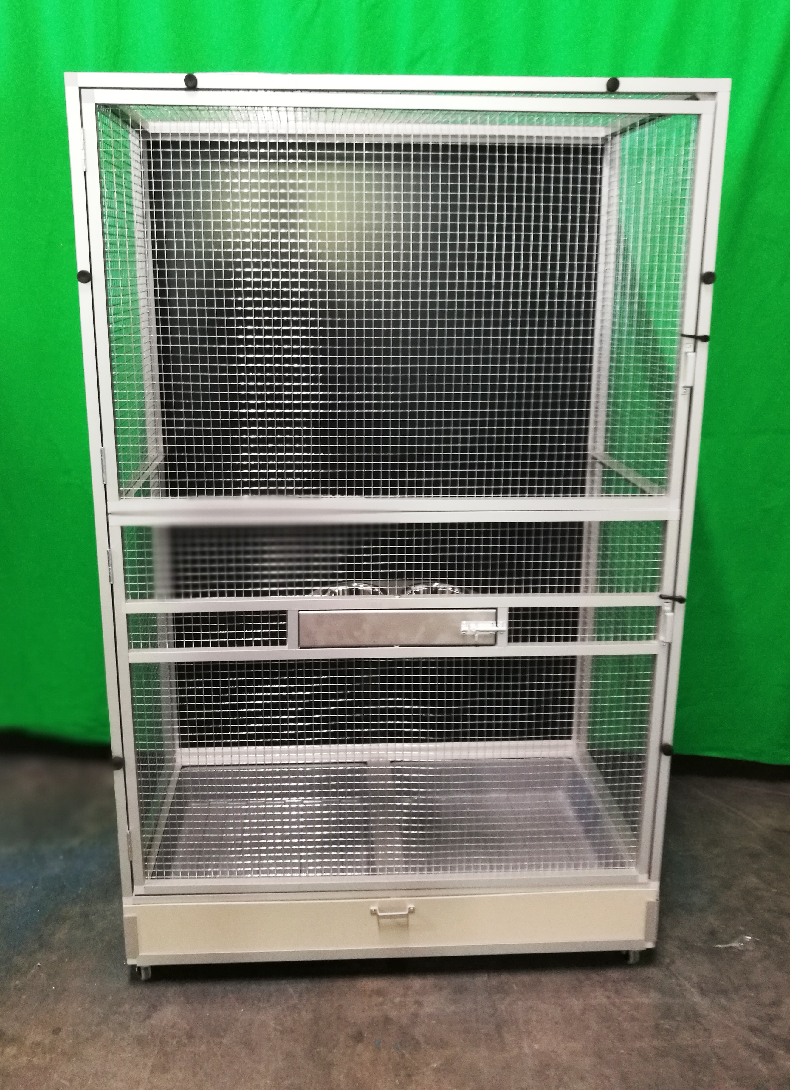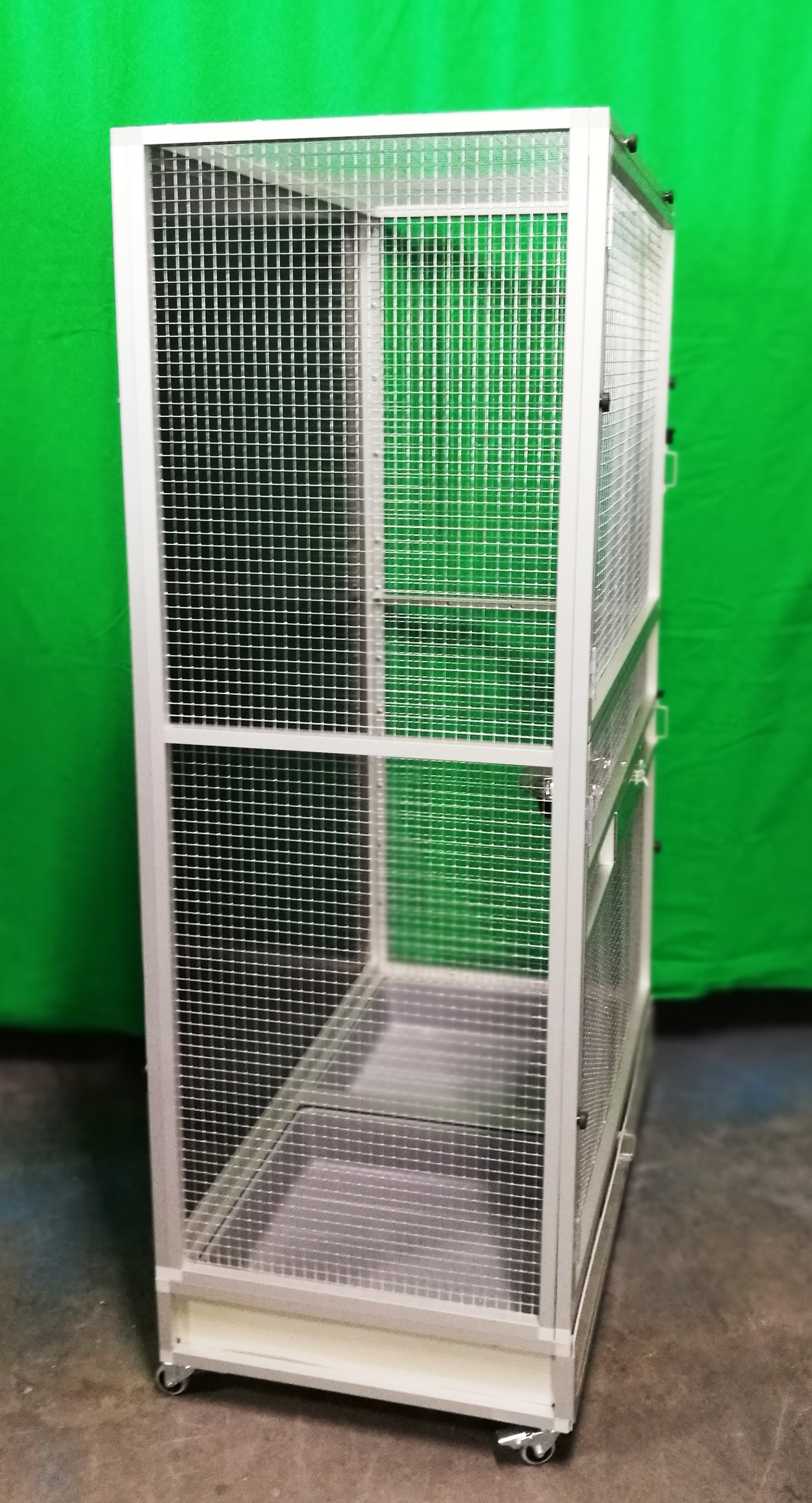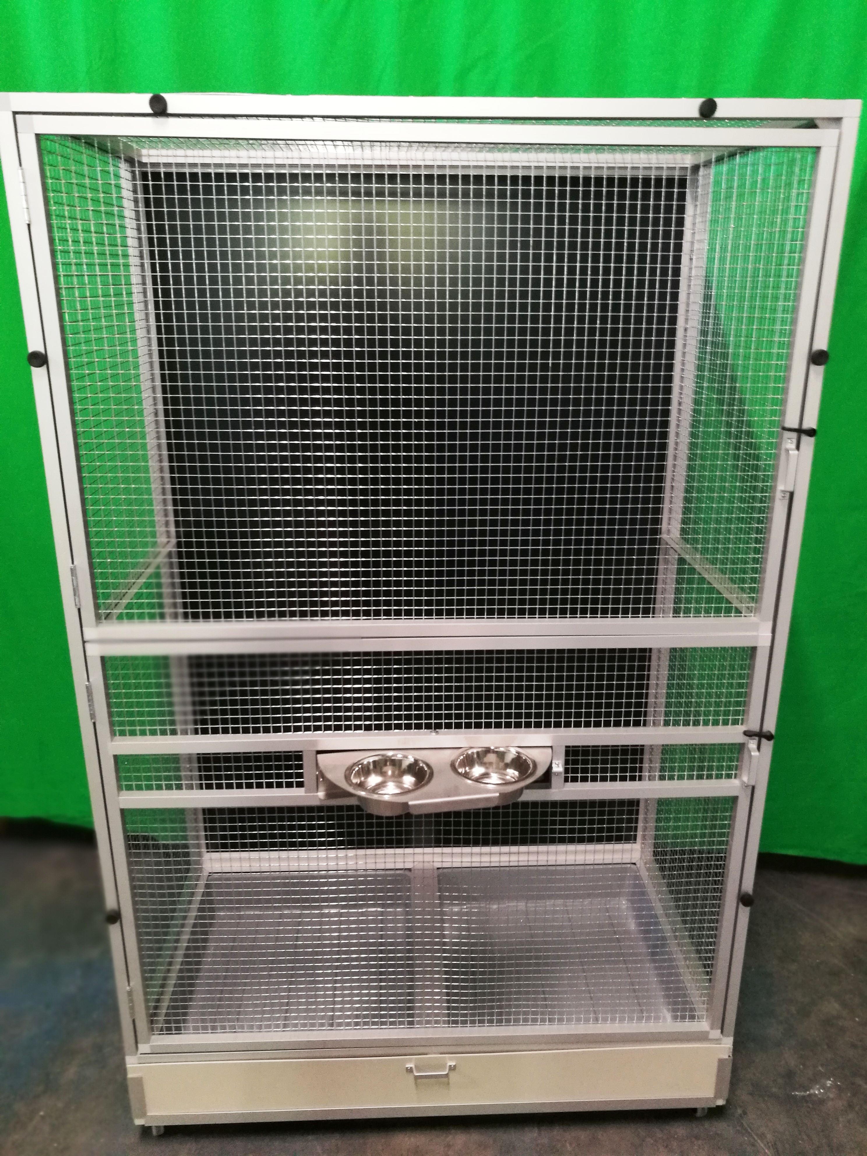 Voliéra je postavená na podvozku Pol2. Prednú stenu si chovateľka navrhla sama. Celá predná stena sa dá otvoriť. Podmienkou bola možnosť rozdelenia voliéry v čase, keď majú mladých na polovicu. Chovateľke išlo o to, aby samica mala pokoj pre svoje mláďatá a nemusela samicu sťahovať do inej klietky. Voliéra je na kolieskach. V podvozku voliéry sú umiestnené dve vaničky. Rozmery voliéry 108x60 výška 174. Pletivo oko 12,7x12,7 mm drôt 1,02mm.