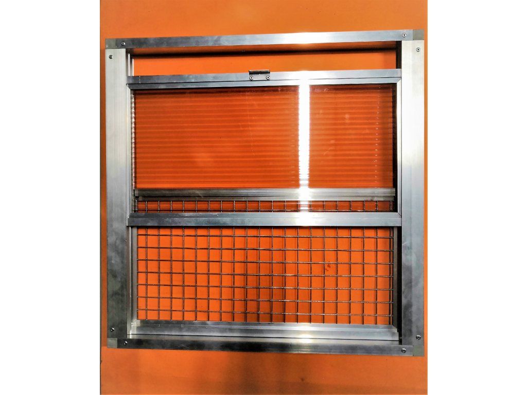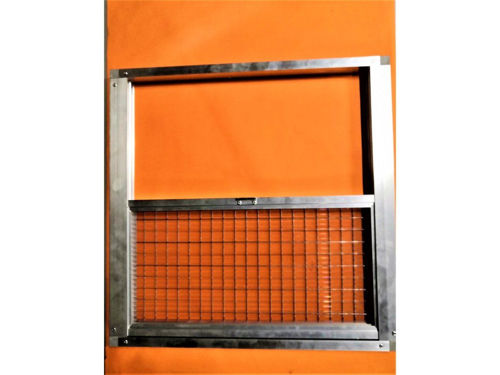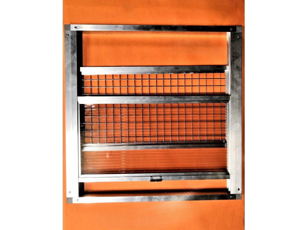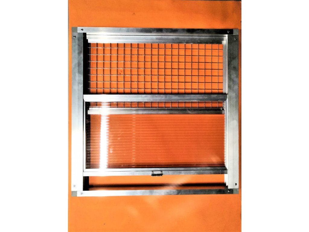 Rozmery výška 60 cm šírka 40 cm sú obvodové rozmery vonkajšieho rámu. Použitá výplň v okne je 10mm polykarbonát. V druhom okne je použité pletivo 19x19 drôt 1,45mm. Pojezdy okien sú podložené plastovým materiálom pre lepší posuv. Každé okno potrebuje samostatné lanko na otvorenie jednotlivých okien.Výletové okno má tri polohy: