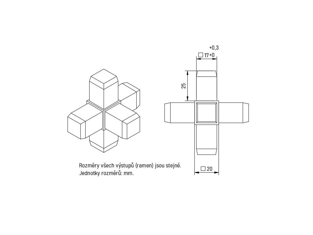 Veľkou výhodou je, že každý výstup na spojke má vlastný nábeh. Obsahujú UV filtre a sú húževnatejšie než klasické spojky. Tento typ spojky je pre profily 20x20x1,5mm, ktorý nájdete u nás v ponuke "Hliníkové profily 20x20x1,5mm".Dodatočné parametre