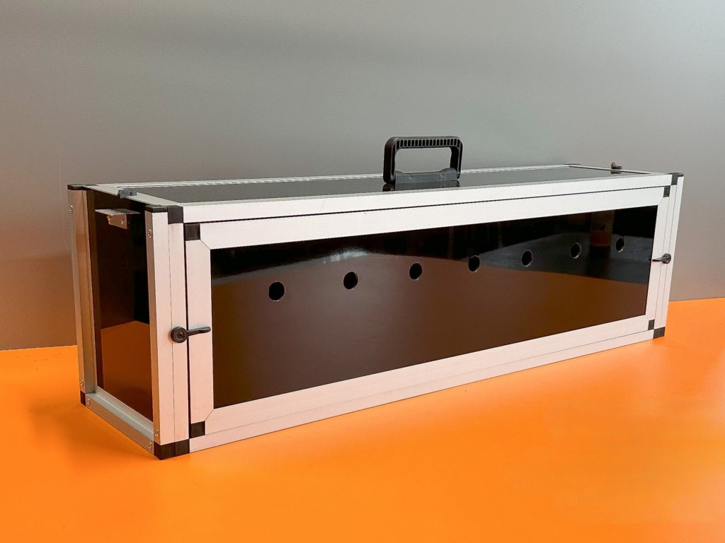 Použité materiály sú veľmi kvalitné a umývateľné. Použité pletivo oko 19x19 sila drôtu 2mm Predná stena, záklop idú ľahko vybrať. Tubus je vyrobený z profilu 15x15x1 mm s povrchovou úpravou elox. Rozmery prepravného tubusu sú šírka 83 cm, hĺbka 20 cm, výška 24 cm. Výplne prepravky sú vyrobené z hliníkového sendviča. Farba môže byť strieborná, zelená, biela, antracitová.Celková váha prepravky je iba 4,5kg. Na želanie môže byť prepravka dlhšia prípadne aj iných rozmerov.Dodatočné parametre