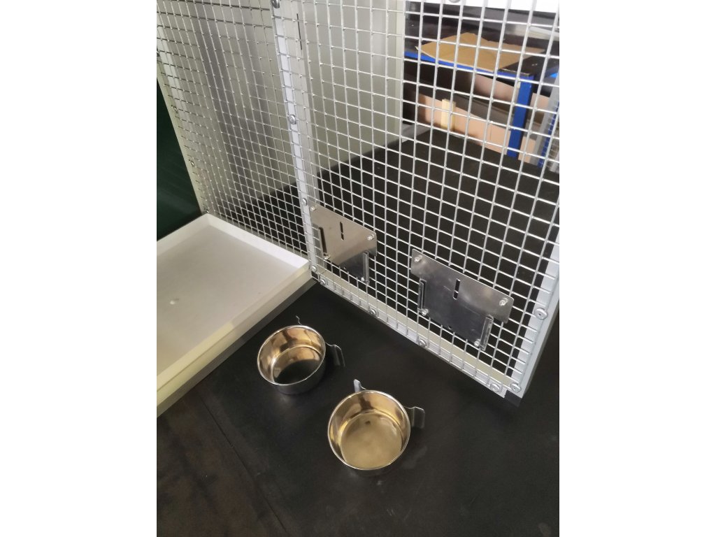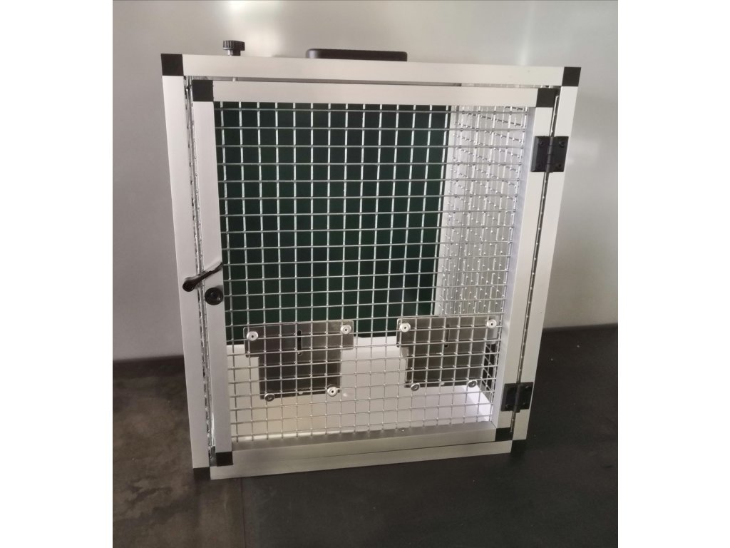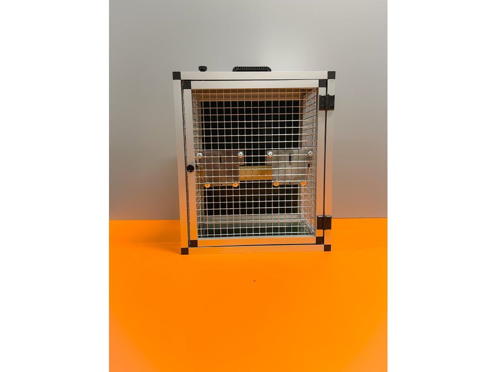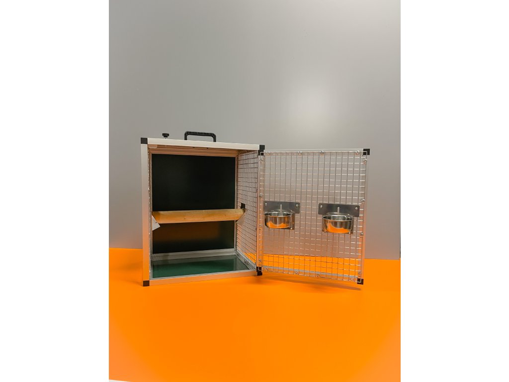 Prepravná klietka s kŕmidlami je vyrobená z profilu 20x20x1,5 mm s povrchovou úpravou eloxovaním.