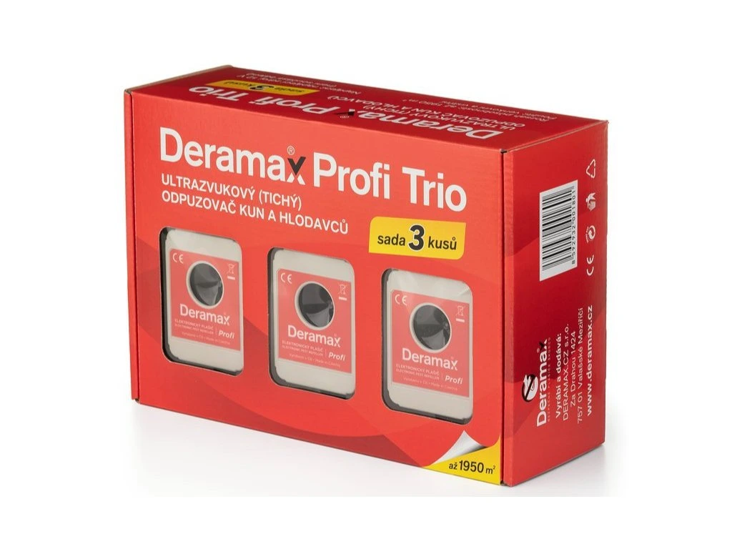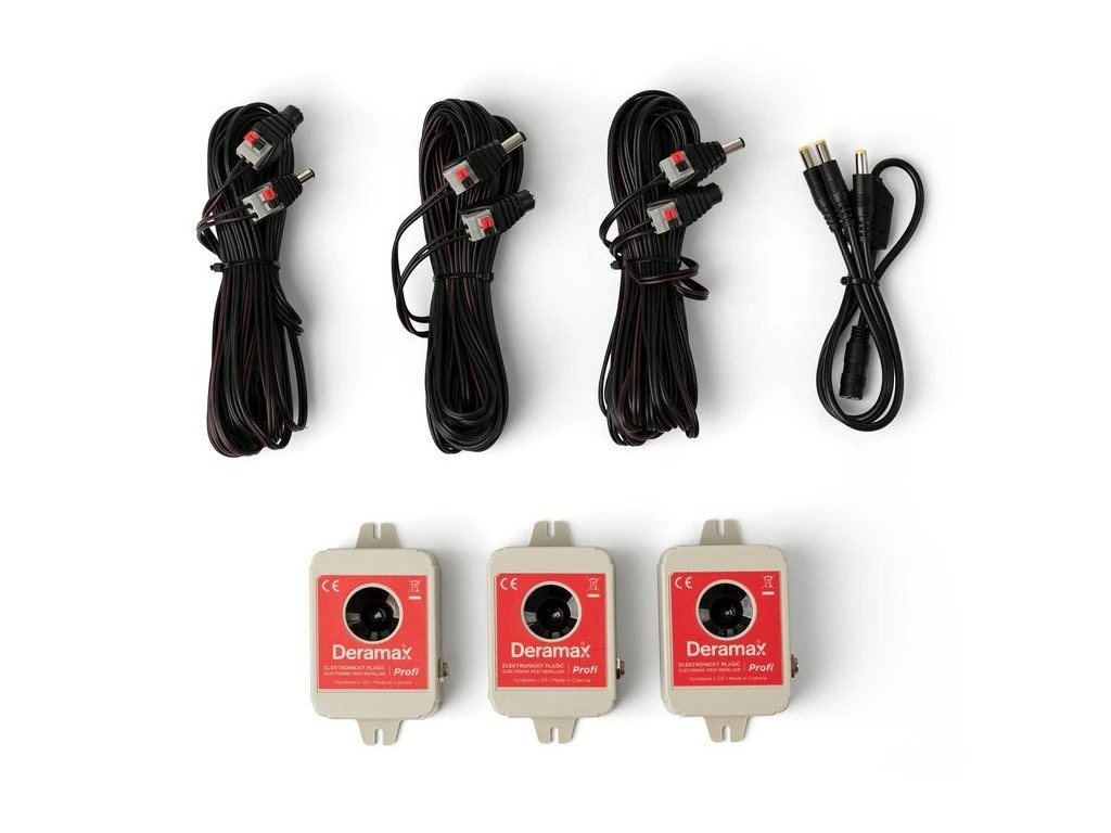 Sada Deramax-Profi-Trio obsahuje 3 ks ultrazvukových plašičov a odpudzovačov hlodavcov najvyššej kvality Deramax-Profi + príslušenstvo.