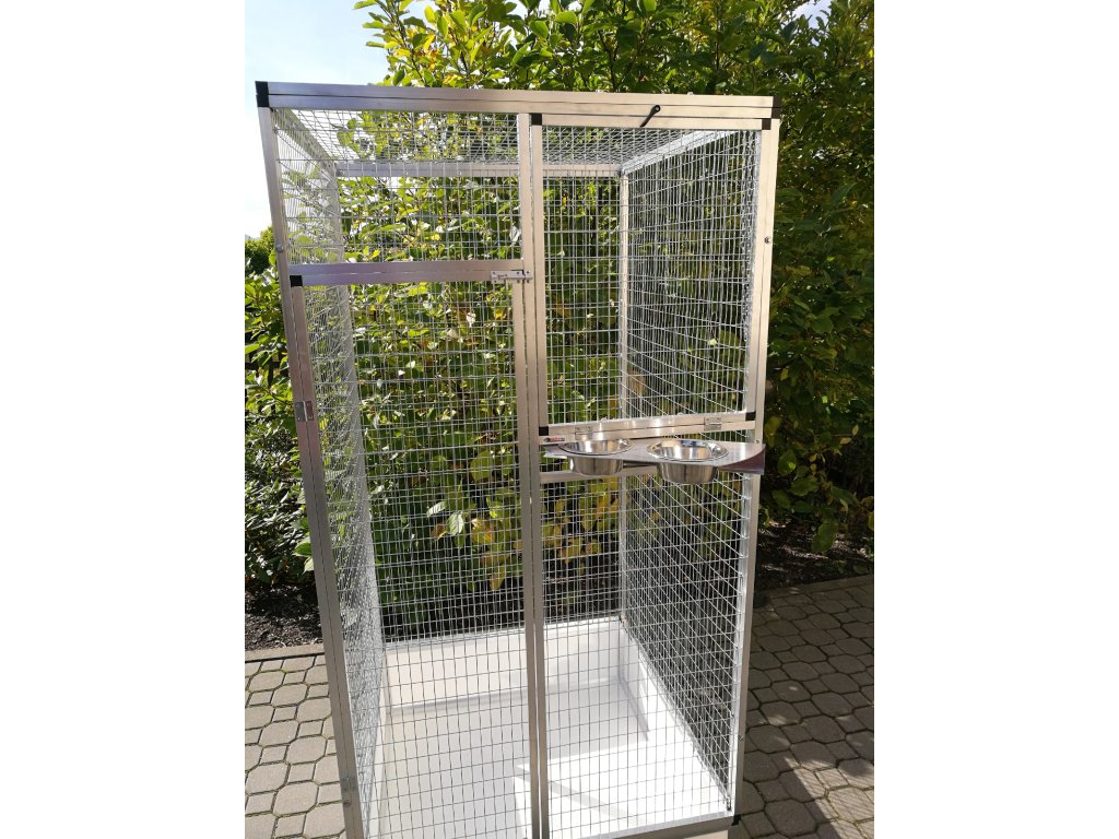 Pod výklopným oknom je umiestnený hliníkový otočný kŕmny pult pre dve nerezové misky s obsahom 0,75 l. V prípade záujmu či potreby chovateľa ide urobiť zámenu na tri nerezové misky o obsahu 0,35 l. Za príplatok je možné namontovať kovové kolieska s gumovou obručou a brzdou.