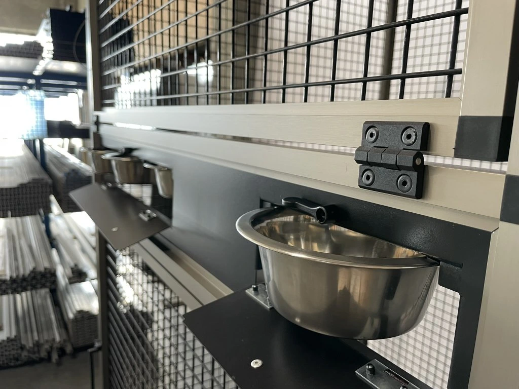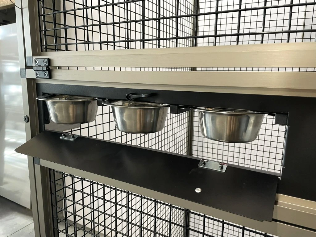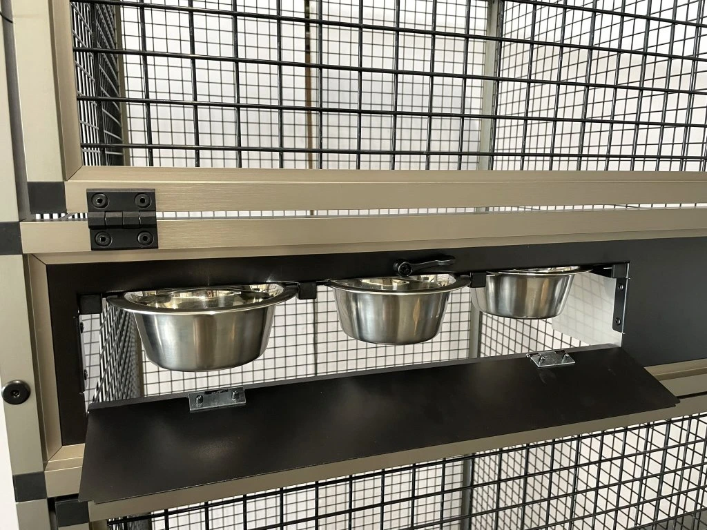 Predná stena je vybavená černým nerezovým krmným pultem KPN 04.