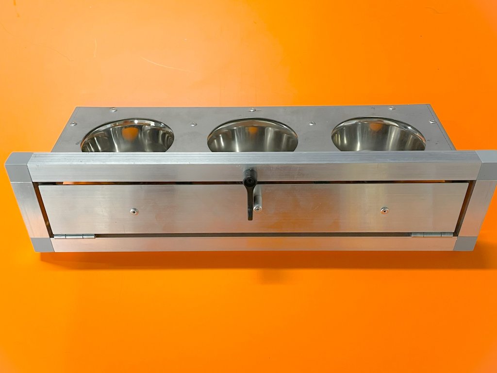 Sila nerezového plechu použitého na základnú dosku je 1 mm. Možnosť kombinácií s inými zásuvnými pultmi, prípadne aj s otočnými pultmi ponúka chovateľovi veľkú možnosť splnenia svojich predstáv, ako zabezpečiť obsluhu svojho chovateľského zariadenia čo najlepšie. Zásuvné i otočné kŕmne pulty (okrem kŕmneho pultu pre Ary) majú na výšku vrátane rámčeka 11 cm. Kŕmny pult je dodávaný v zloženom stave vrátane rámčeka. Rám je tvorený z hliníkového profilu 20x20x1,5 mm. Ak sa zákazník rozhodne zabudovať kŕmny pult priamo do konštrukcie voliéry, je ideálne nechať si zaslať kŕmny pult a rámček samostatne. V rámčeku potom možno jednoducho vymeniť spojky a zabudovať pult priamo do konštrukcie.Kŕmny pult obsahuje jednu misku s objemom 180ml na vodu, druhú misku s objemom 180ml na ovocie, zeleninu. Tretia miska s objemom 180ml na zrno.